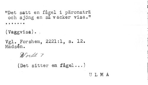 //// "Det satt en fågel i päronaträ i //// och sjöng en så vacker visa." //// a //// (Vaggvisa). //// Vgl. Forshem, 2221:1, s. 12. //// Madsån. //// ^ ! //// ! //// (Det sitter en fågel...) ////