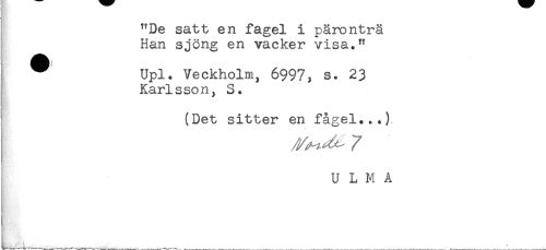 //// i "De satt en fågel i päronträ //// t Han sjöng en vacker visa." //// ! ^ Upl. Veckholm, 6997, s. 23 //// { Karlsson, S. //// (Det sitter en fågeln.). //// U L M A ////