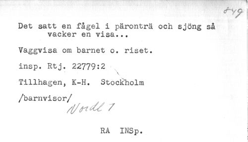 //// Det satt en fågel i päronträ och sjöng så //// vacker en visa... //// Vaggvisa om barnet o. riset. //// insp. Rtj. 22779:2 //// Tillhagen, K-H. Stockholm //// t //// /barnvisor/ ! //// RA INSp. //// S //// : //// : ////