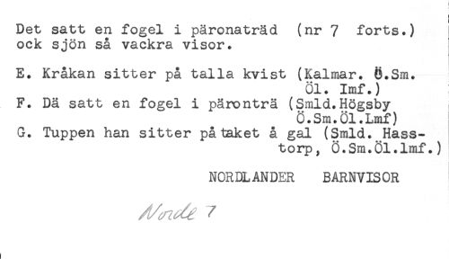 //// Det satt en fogel i päronaträd (nr 7 forts.) //// ock sjön så vackra visor. //// E. Kråkan sitter på talla kvist (Kalmar. Ö.Sm. //// Öl. Imf.) //// F. Dä satt en fogel i päronträ (Smld.Högsby //// Ö.Sm.Öl.Lmf) //// G. Tuppen han sitter på taket å gal (Smid. Hass- //// torp, Ö.Sm.Öl.lmf.) //// NORDLANDER BARNVISOR //// t ////