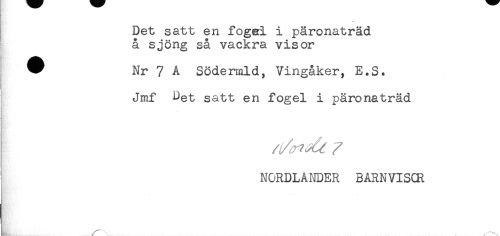 //// Det satt en fogar! i päronaträd //// å sjöng så vackra visor //// ^ Nr 7 A Södermld, Vingåker, E.S. //// Jmf Det satt en fogel i päronaträd //// NORDLA NDER BÅRN VISCR ////