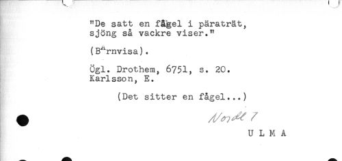 //// "De satt en fågel i päraträt, //// sjöng så vackre viser." //// (Barnvisa). //// R, //// Ögl. Drothem, 6751, s. 20. //// Karlsson, E. //// * //// (Det sitter en fågel...) //// ^ ^ //// /