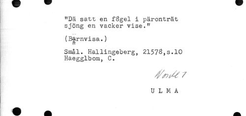 //// "Dä satt en fRgel i päronträt //// sjöng en vacker vise." //// — — //// (Barnvisa.) //// 3 //// Smal. Hallingeberg, 21573,s.10 //// Haegglbom, C. //// ^^ //// /U L M A ////