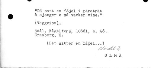 //// "Dä satt en fRjel i päraträt //// ^ å sjonger e så vacker vise." //// (Vaggvisa). //// } //// Smål. Fågelfors, 10631, s. 46. //// Granberg, G. //// (Det sitter en fågel...) //// U L M A //// L___. _ ////