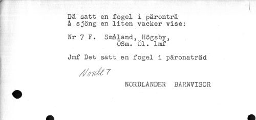 //// f ^ //// Dä satt en fogel i päronträ //// a sjöng en liten vacker vise: //// . . ^. - . _ . ^ //// Nr 7 F. Småland, Högsby, //// ÖSm. öl. lmf //// Jmf Det satt en fogel i päronaträd //// NORDLANDER BARNVISOR //// - //// K - ////