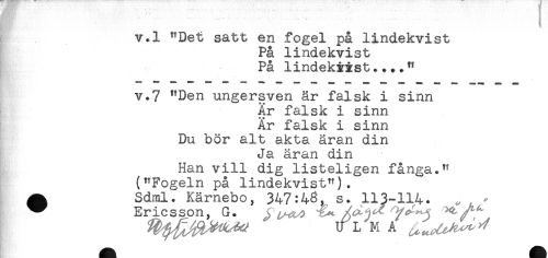 //// an .. . . ...... . //// v.l "Det satt en fogel på lindekvist //// På lindekvist //// På lindekyist...." //// v.7 "Den ungersven är falsk i sinn //// Är falsk i sinn //// Är falsk i sinn //// Du bör alt akta äran din //// Ja äran din //// Han vill dig listeligen fånga." //// ("Fogeln på lindekvist"). //// ^ Sdml. Kämebo, 347:s. 113-114. <, , ' //// ^ Ericsson, G. ^ //// U L M Å ^^^^ ////