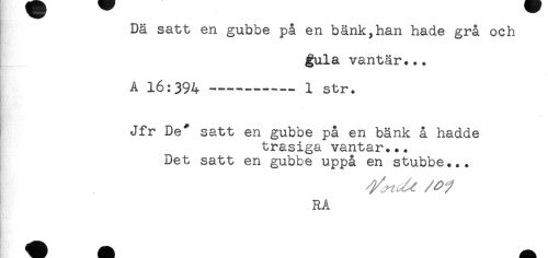 //// Dä satt en gubbe på en bänk,han hade grå och //// gula vantär... //// A 16:394 ---— 1 str. //// Jfr De* satt en gubbe på en bänk å hadde //// trasiga vantar... //// Det satt en gubbe uppå en stubbe... //// RA ////