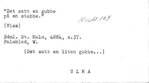 //// "Det satt en gubbe //// på en stubbe." //// (Visa) //// Sdml. St. Malm, 4664, s.37. //// Palmblad, W. //// (Det satt en liten gubbe...) //// i //// U L M A ////