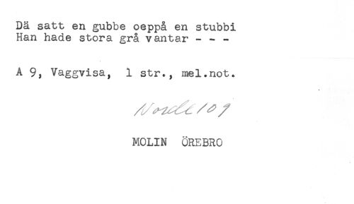 //// Dä satt en gubbe oeppå en stubbi //// Han hade stora grå vantar - - - //// A 9, Vaggvisa, 1 str., mel.not. //// * //// MOLIN ÖREBRO ////