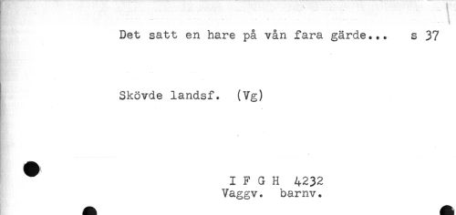 //// * . / , '. . i //// Det satt en hare på vån fara gärde... s 37 //// Skövde landsf. (Vg) //// I F G H 4232 //// Vaggv. barnv. ////
