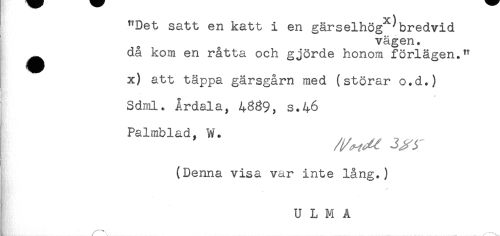 //// "Det satt en katt i en gärselhög ^bredvid //// vägen. //// ^ då kom en råtta och gjorde honom förlägen." //// x) att täppa gärsgårn med (störar o.d.) //// % //// Sdml. Årdala, 4889, s.46 //// Palmblad, W* //// (Denna visa var inte lång.) //// . //// . //// U L M A //// ^—— ////