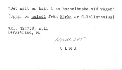 //// "Det satt en katt i en hasselbuske vid vägen" //// (Uppg. om melodi från Närke av G.Kallstenius) //// Vgl. 3247:8, s.ll //// Bergstrand, M. //// v //// U L M A ////