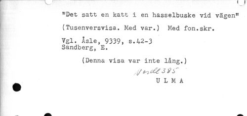 //// "Det satt en katt i en hasselbuske vid vägen" //// (Tusenversvisa. Med var.) Med fon.skr. //// -* //// Vgl. Asle, 9339, s.42-3 //// Sandberg, E. //// (Denna visa var inte lång.) //// U L M A ////