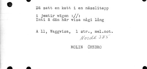 //// Dä satt en katt i en nässlitapp //// i jemtir vägen ://: //// Inti ä dän här visa någi lång //// A 11, Vaggvisa, 1 str., mel.not. //// MOLIN ÖREBRO ////