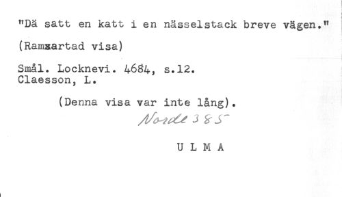 //// "Dä satt en katt i en nässelstack breve vägen." //// (Ramxartad visa) //// Smal. Locknevi. 4684, s.12. //// Claesson, L. //// (Denna visa var inte lång). //// U L M A ////