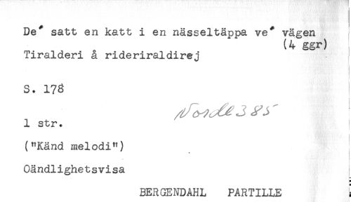 //// De* satt en katt i en nässeltäppa ve* vägen //// (4 ggr) //// Tiralderi å rideriraldirej //// S. 178 //// 1 str. //// < //// ("Känd melodi") //// -4 //// Oändlighetsvisa //// BERGENDAHL PARTILLE = ////