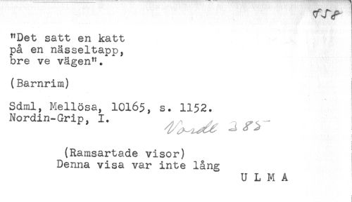 //// "Det satt en katt //// på en nässeltapp, //// bre ve vägen" //// /{ //// (Barnrim) //// Sdml, Mellösa, 1016$, s. 1152. //// N.rdin-Grip, 1. - //// (Ramsartade visor) //// Denna visa var inte lång //// U L M A ////