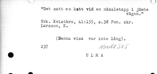 //// "Det satt en katt vid en nässletapp i jämte //// vägen." //// Nrk. Kvistbro, 41:155, s.33 Fon. skr. //// Larsson, K. //// (Benna visa var inte lång). //// 237 //// ^ U L M A //// __ ^^^^ ^^^ ////