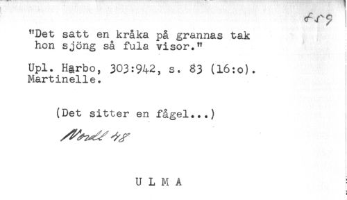 //// "Det satt en kråka på grannas tak //// hon sjöng så fula visor." //// j ! //// t //// Upl. H§rbo, 303:942, s. 63 (l6:o). //// Martinelie. //// (Det sitter en fågel...) //// ) //// t //// U L M A ////