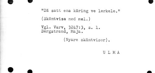//// "Dä satt ena käring ve lerkele." //// (Skämtvisa med mel.) //// Vgl. Varv, 3247:3, s. 1. //// Bergstrand, Maja. //// (Nyare skämtvisor). //// U L M A ////