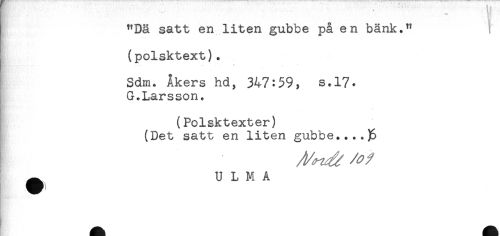 //// "Dä satt en liten gubbe på en bänk." ! //// (polsktext). //// ... t< //// Sdm. Åkers hd, 347:59, s.17* //// G.Larsson. //// (Polsktexter) //// (Det satt en liten gubbe.... )S //// ^ U L M A ////