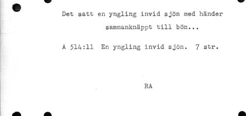 //// Det satt en yngling invid sjön med händer //// sammanknäppt till bön... //// . //// A $14:11 En yngling invid sjön. 7 str. //// RA ////