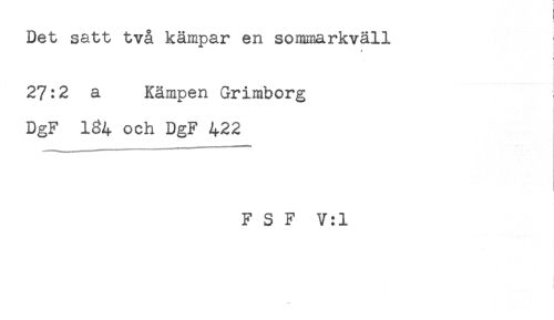 //// Det satt två kämpar en sommarkväll //// * //// < //// 27:2 a Kämpen Grimborg //// DgF 134 och DgF 422 //// F S F V:1 //// *** ////