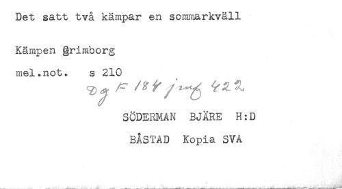 //// Det satt två kämpar en sommarkväll //// Kämpen grimborg //// mel.not. s 210 //// SÖDERMAN BJARE H:D //// BÅSTAD Kopia SVA ////
