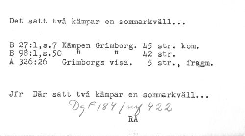 //// Det satt två kämpar en sommarkväll... //// B 2?:l,s.7 Kämpen Grimborg. 45 str. kom. //// B 93:1,s.50 " " str. //// Å 326:26 Grimborgs visa. 5 str., fragm. //// Jfr Där satt två kämpar en sommarkväll... ////