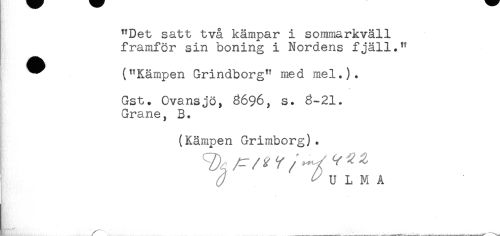 //// "Det satt två kämpar i sommarkväll //// framför sin boning i Nordens fjäll." //// ^ ("Kämpen Grindborg" med mel.). //// * //// Gst. Ovansjö, 3696, s. 3-21. //// Grane, B. //// (Kämpen Grimborg). //// /r / ^ / / ,, / V ^ ^ //// U L M A //// } //// f. //// ! i ^ ^ - —. //// ^ -- ---- ^____—:___ - ___.____-_____ ////