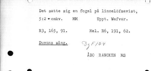 //// Det satte sig en fogel på linnelöfsavist, //// ? ** //// 5:2^-omkv. MM Uppt. Wefvar. //// R3, 165, 91. Mel. R6, 191, 62. //// Duvans sång. //// /^ ÅBO RANCKEN MS ////
