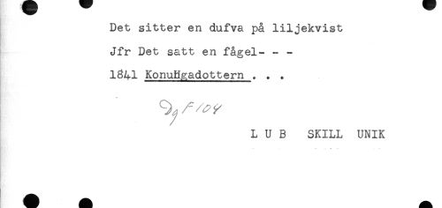 //// Det sitter en dufva på liljekvist //// Jfr Det satt en fågel--- //// 1341 Konungadottern . . . //// L U B SKILL UNIK ////