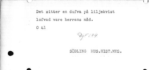 //// Det sitter en dufva på liljekvist //// t* * //// lofvad vare herrans nåd. //// 0 41 //// ^ SÖDLING MUS.HIST.MUS. //// - . * * - ** ** t. ////