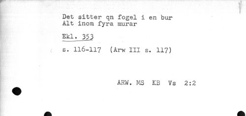 //// Det sitter qn fogel i en bur //// Alt inom fyra murar //// Ekl. 353 //// K ( s. 116-117 (Arw III s. 117) //// ARW. MS KB Vs 2:2 //// .. * ////