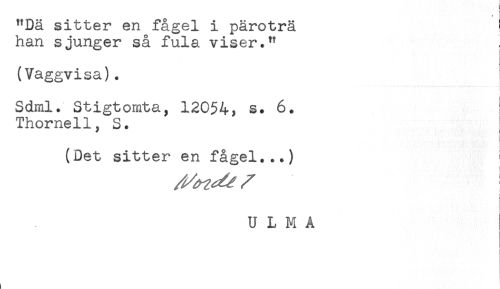 //// "Dä sitter en fågel i päroträ ! //// han sjunger så fula viser." //// (Vaggvisa). //// Sdml. Stigtomta, 12054, s. 6. //// Thornell, S. //// (Oet sitter en fågel...) //// i //// U L M A ////