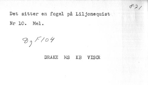 //// Det sitter en fogel på Liljonequist //// Nr 10. Mel. //// DRAKE MS KB VISCR ////