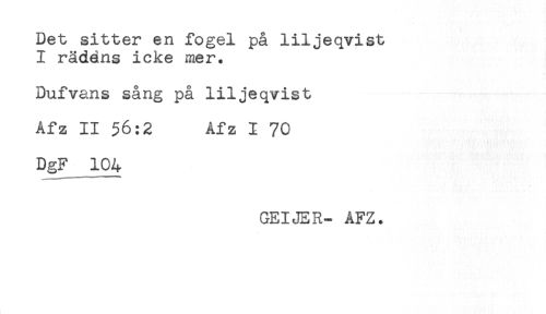 //// Det sitter en fogel på liljeqvist //// I räddns icke mer. //// Dufvans sång på liljeqvist //// Afz II $6:2 Afz I 70 //// DgF 104 //// GEIJER- AFZ. ////
