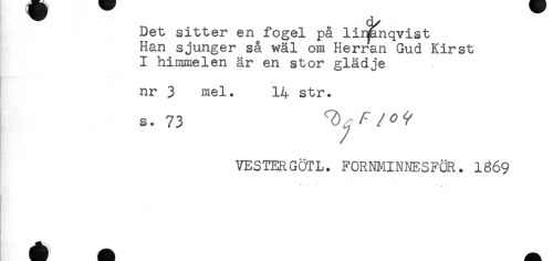 //// Det sitter en fogel på lir^mqvist //// Han sjunger så wäl om Herran Gud Kirst //// I himmelen är en stor glädje //// nr 3 mel. 14 str. //// s. 73 ^ //// . //// VESTERGÖTL. FORNMINNESFÖR. I869 //// '' . " ' - - ////