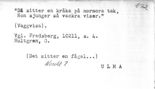 //// "Då sitter en kråka på mormora tak, //// Hon sjunger så vackra viser." //// (Vaggvisa). //// - //// Vgl. Fredsberg, 10211, s. 4. //// Hultgren, G. //// i //// (Det sitter en fågel...) //// ^^ 7 U L M A //// -a //// B ////