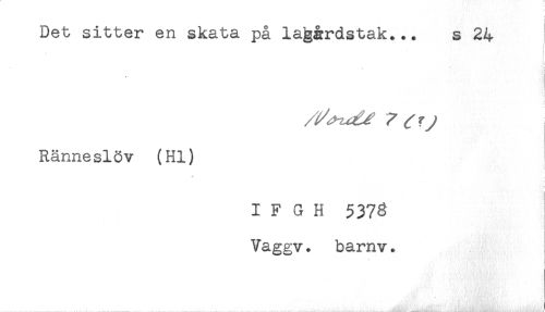 //// Det sitter en skata på la^gårdstak*.. s 24 //// . //// * < //// i //// Ränneslöv (Hl) //// I F G H 5373 //// Vaggv. barnv. //// * ////