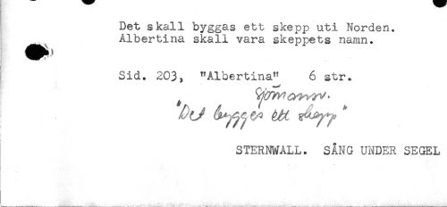 //// Det skall byggas ett skepp uti Norden. //// ^^ Albertina skall vara skeppets namn. //// Sid. 203, "Albertina" 6 str. //// i //// STERNWÅLL. SÅNG UNDER SEGEL ////