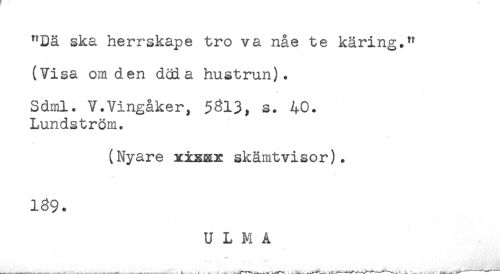 //// "Dä ska herrskape tro va nåe te käring." //// (Visa om den döda hustrun). //// Sdml. V.Vingåker, 5313, s. 40. //// Lundström. //// (Nyare xixax skämtvisor). //// U L M A //// s .- - < . ** ////