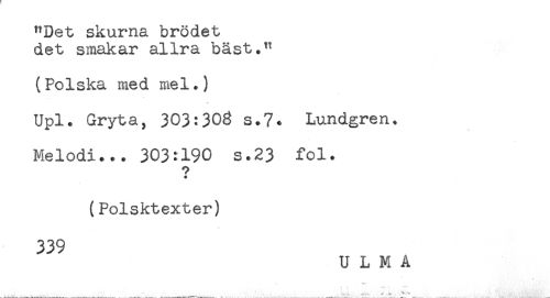 //// "Det skurna brödet //// det smakar allra bäst." //// (Polska med mel.) //// Upl. Gryta, 303:303 s.7* Lundgren. //// Melodi... 303:190 s.23 fel. //// ? //// + //// (Polsktexter) //// U L M A //// ***** ////
