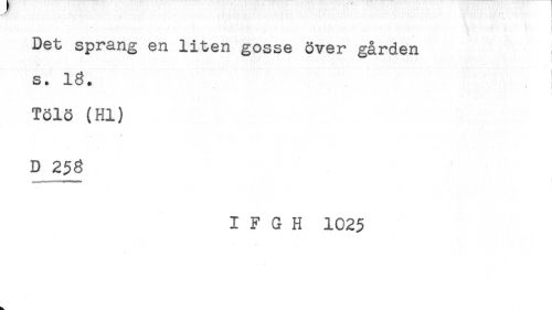 //// Det sprang en liten gosse över gården //// s. 18. //// t //// Tölö (Hl) //// D 258 //// I F G H 1025 ////