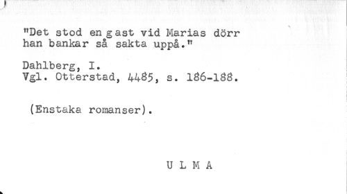 //// "Det stod en gast vid Marias dörr //// han bankar så sakta uppå." //// Dahlberg, I. ! //// Vgl. Otterstad, 4435, s. 136-133. ; //// i //// (Enstaka romanser). //// a //// < //// < ////