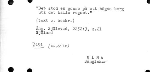 //// "Det stod en gosse på ett högan berg //// uti det kalla regnet." //// (text o. beskr,) //// Ang. Själevad, 2252:3, s.21 //// Sjölund ////