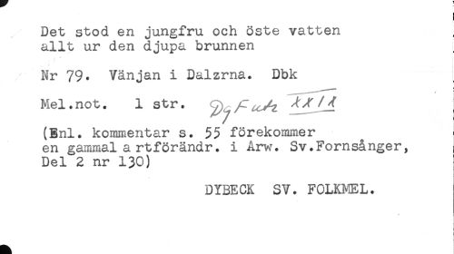 //// ! //// ! //// Det stod en jungfru och öste vatten ; //// allt ur den djupa brunnen l //// ^ T //// Nr 79. Vänjan i Dalzrna. Dbk //// Mel.not. 1 str. ^/r^/^ ^/f //// (Enl. kommentar s. 55 förekommer //// en gammal artförändr. i Arw. Sv.Fornsånger, ; //// Del 2 nr 130) //// DYBECK SV. FOLKMEL. //// ' ////