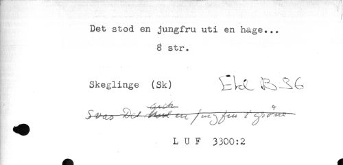 //// ..... --r - ' < ^ //// Det stod en jungfru uti en hage... //// 8 str. //// Skeglinge (Sk) //// L U F 3300:2 //// * ////