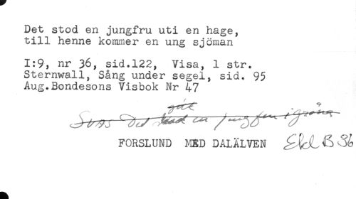 //// Det stod en jungfru uti en hage, //// till henne kommer en ung sjöman //// 1:9, nr 36, sid.122, Visa, 1 str. //// Sternwall, Sång under segel, sid. 95 //// Aug.Bondesons Visbok Nr 47 //// FORSLUND MED DALÄLVEN ////