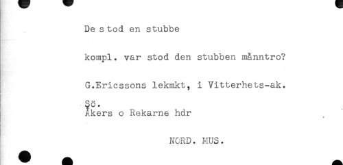 //// } . //// De s tod en stubbe //// kompl. var stod den stubben månntro? //// G.Ericssons lekmkt, i Vitterhets-ak. //// i - So. //// Åkers o Rekarne hdr //// * //// NORD. MUS. ////